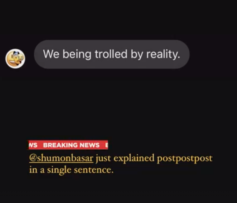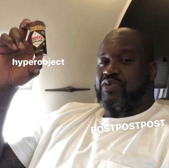 I’m quoting this to forward my proposition on what comes after this progression of paradigms in art and aesthetics. Now that the problem of aesthetics is ontological, it is time for the ready-made or found-object to be thought of in non-physical terms. In OOO, not only thoughts and concepts are objects, but also experiences. What would it mean if experience is the new found-object? an experience that can truly bring you closer to accessing a deeper reality? Here, POSTPOSTPOST, a cultural movement that is most concerned with the avant-garde, extends an invitation to OOO to take a look through its lens. Its ridiculous name mocks its predecessor, “Post-postmodernism”, but simultaneously, inevitably acknowledges it. The text stylization in uppercase is a response to the excessive & loud state of pop culture, rendering it less likely to be integrated in traditional academic language or ‘artspeak’. It’s intentionally chopping ‘modernism’ off its tail cementing its irrelevance. And obviously, it voices the generational imperative to “post, post and post” to exist.